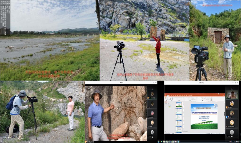 2019级水文与水资源工程专业、地下水科学与工程专业共计93名本科生参与本次线上实习培训。为保证线上实习的效果,配备具有十年以上资深实习经验的肖长来、梁秀娟、方樟和冯波老师组成秦皇岛实习队,实习期为期7天,严格执行线上实习方案,白天野外踏勘,摄制地质实习影像,实习期共摄制约30个小时讲解视频和1000余张野外地质现象照片,晚上制作ppt讲解内容,剪辑讲解视频。每天下午6点按照秦皇岛地区主要调查路线及典型地质现象开设2个小时视频会议授课,具体包括秦皇岛野外地质概况、大石河河谷地表水、地下水形成与分布的调查分析;亮甲山奥陶系下同灰岩岩溶裂隙水形成条件与富集规律;东部落寒武系府君山组灰岩岩溶裂隙水形成条件分析;黑山嘴断裂构造低温热水泉的成因分析等内容,指导老师积极组织学生提前预习实习内容,通过腾讯会议、qq及微信等网络平台进行视频与图文生动细致的讲解和答疑,课堂反馈热烈。学生在线学习、提交实习报告,实习指导老师则是在线答疑讲解并评价项目成果。整体来看,线上实习获得了较好的实训效果,为学生兴城野外实习做好理论知识基础准备,这一模式也避免了疫情期间实习对师生可能产生的安全隐患。