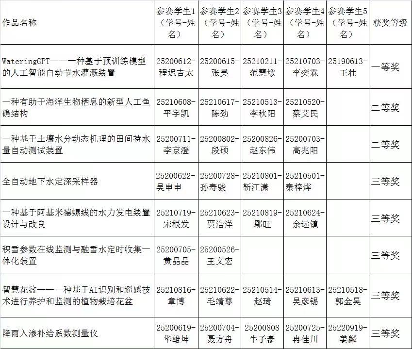 根据《关于举办第八届全国大学生水利创新设计大赛的通知》(水教协[2023]11号)要求,自拍视频 于2023年4月28日组织了水利创新设计大赛院赛,对本次申报的8个作品进行了评审,确立一等奖1项,二等奖2项,三等奖5项,推荐《WateringGPT——种基于预训练模型的人工智能自动节水灌溉装置》、《一种有助于海洋生物栖息的新型人工鱼礁结构》、《一种基于土壤水分动态机理的田间持水量自动测试装置》三项作品参加国赛,现予公示,公示时间2023年4月28日至5月4日,如有异议,请拨打电话88502167。
