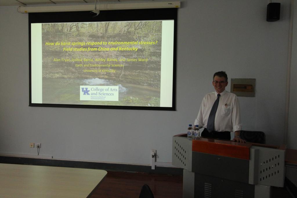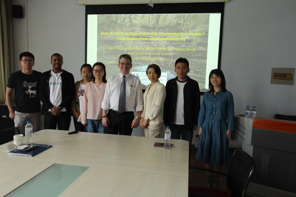 师生作题为“How do Karst Spring Response to Environmental Stresses? Field Studies from China and Kentucky (中国与肯塔基典型岩溶泉对环境变化的影响机理)”学术报告。此学术报告由地下水科学与工程系李鸿雁教授主持,在报告会上,Alan 教授阐述了肯塔基州岩溶泉的特点及对环境变化的影响,并与贵州省岩溶泉的特点为例向师生们分享了对比差异。师生们对Alan教授的研究课题表示很感兴趣,并与Alan 教授就报告研究方向进行了深入探讨,收获颇丰。