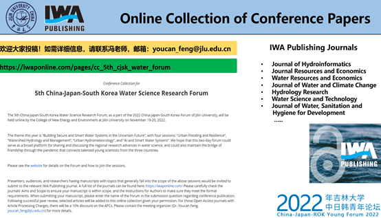 作为本次会议协办单位,国际水协会出版社(IWA Publishing)为会议创建会议文集,收录符合本次论坛主题的相关文稿,详情请见网站(//iwaponline.com/pages/cc_5th_cjsk_water_forum)。参会嘉宾或有意者可投至IWA publishing旗下的任一期刊,在提交文章时请注明本次论坛名称(The 5th China-Japan-South Korea Water Science Research Forum),并将您的投稿信息告知我们([email protected])。对于IWA Publishing旗下的开源期刊,我们将提供10%的版面费优惠。