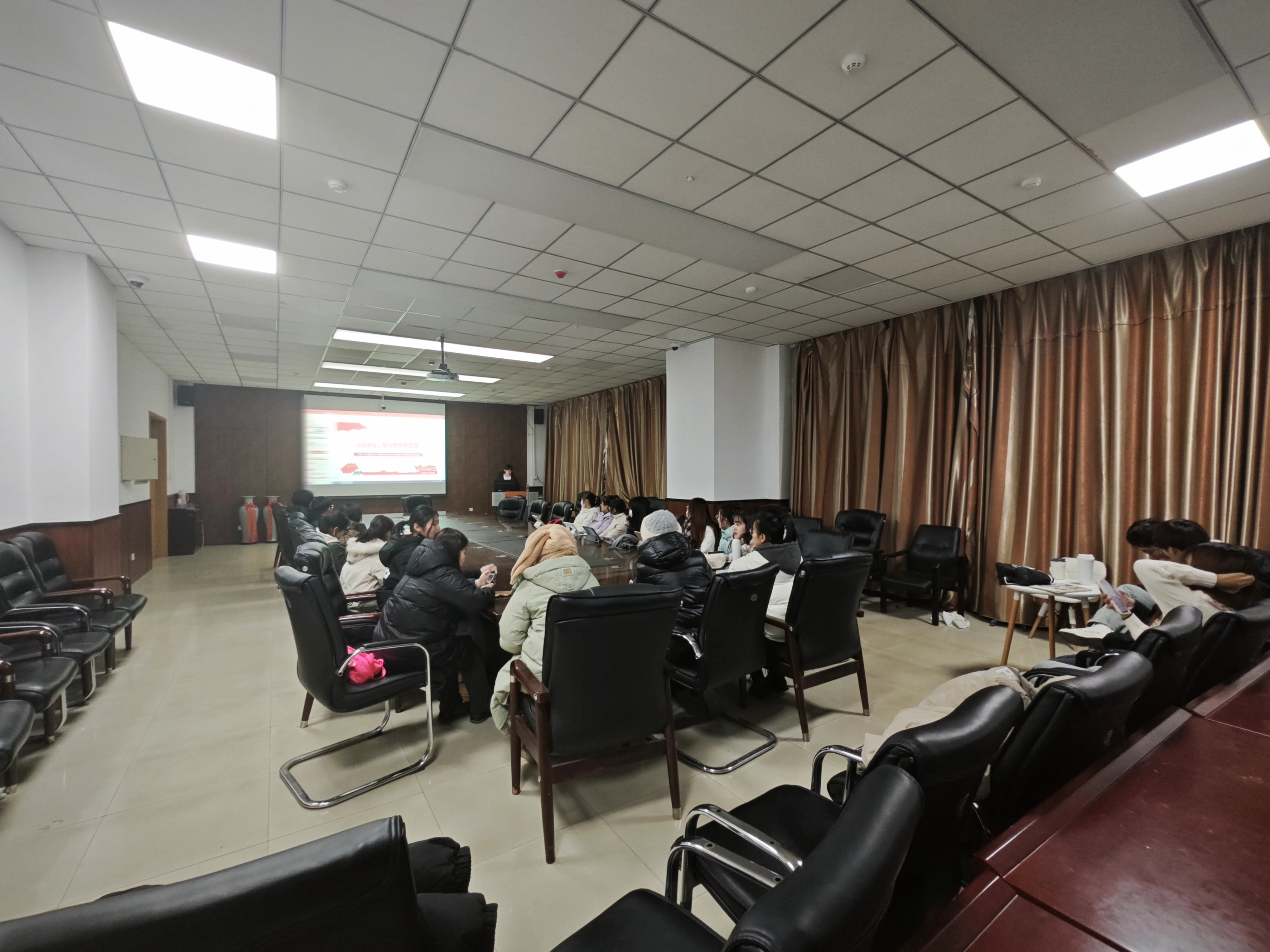 部分团支书带领团支部同学讨论为什么要节约用水,如何节约用水等,阐述节约水资源在中国绿色可持续发展中的重要性。同学们就中国绿色可持续发展的政策已经水资源规划与管理进行了思考与讨论。