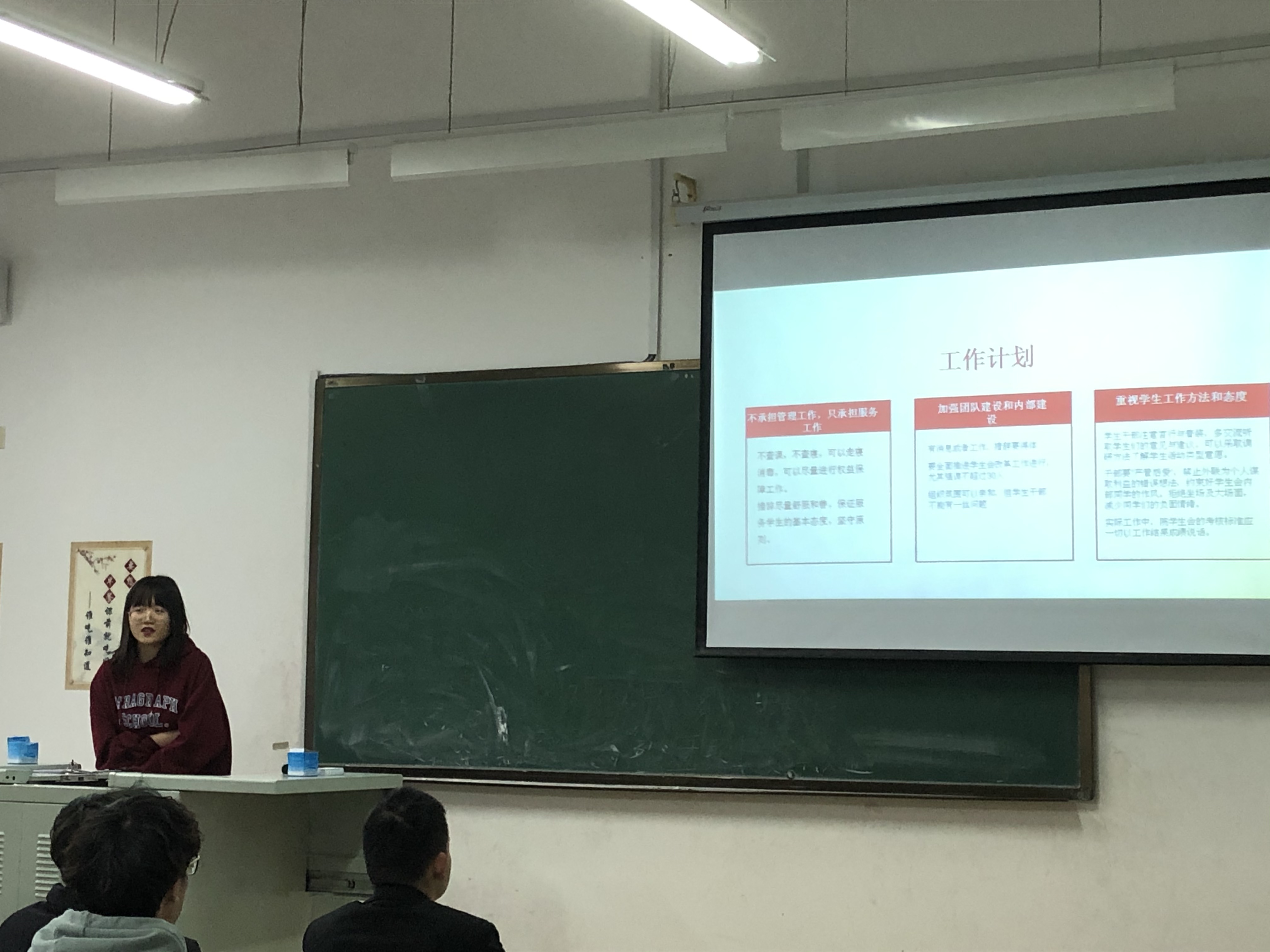 随后,学习会就学院接下来的工作安排发布了详细的任务说明,要求做到不承担管理工作,只承担服务工作。同时,要加强团队建设和内部建设并重视学生工作的方法和态度,力求一切以工作结果成绩说话,保证服务学生的基本态度,坚守原则。大会的最后一项议程,院学生会主席团成员分别就各自所负责的板块进行了自我想法的阐述。牛梦圆同学从团委学生会成果分享大会的积极性问题出发,借用自己的服务经历讲述了学生会工作的初心和原则。张舜尧同学则就综合事务部面对可能存在的作风问题必须“防微杜渐、绝不涉足”的原则进行了强调。紧接着,孙嘉鸿同学又在学生活动的宣传方面发表了自己的看法,希望大家在学生会的各项活动上共同协作,力求尽善尽美。