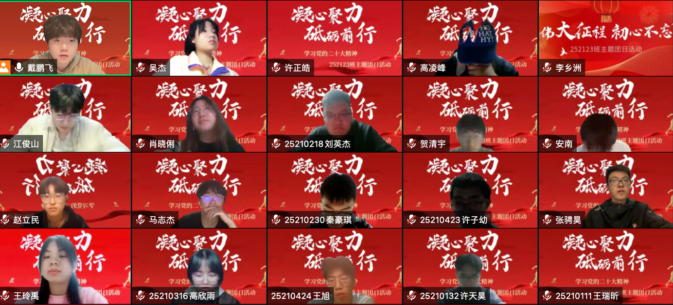 通过学习党的二十大精神和回顾新时代十年伟大变革,各支部青年团员结合自己的学习感悟与体会。252023团支部刘泽群同学表示:中国特色社会主义进入新时代,广大青年必须不断学习,才能跟上时代前进的脚步,才能融入民族复兴的伟业。如果不能主动加快知识更新、优化知识结构、拓宽眼界和视野,就无法赢得主动、赢得优势、赢得未来。252105团支部多位同学踊跃发言,不仅表达了学习青年大学习对我们的重要意义,还表达了我辈青年应积极响应党的号召,让青春在全面建设社会主义现代化国家的火热实践中绽放绚丽之花。