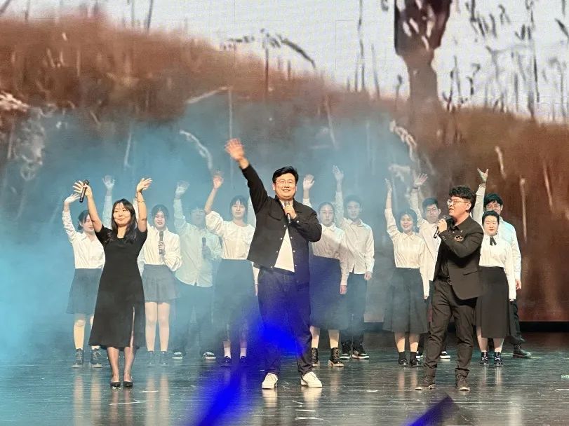 最后,在2020级辅导员霍美汐老师、2022级辅导员母茂松老师、2019级姜岳彤学长和第五届团学组织主要干部成员共同合唱《奔跑》的歌声中,所有领导、老师与演职人员合影,在一片欢乐的氛围中,本届迎新晚会画下了圆满的句号。
