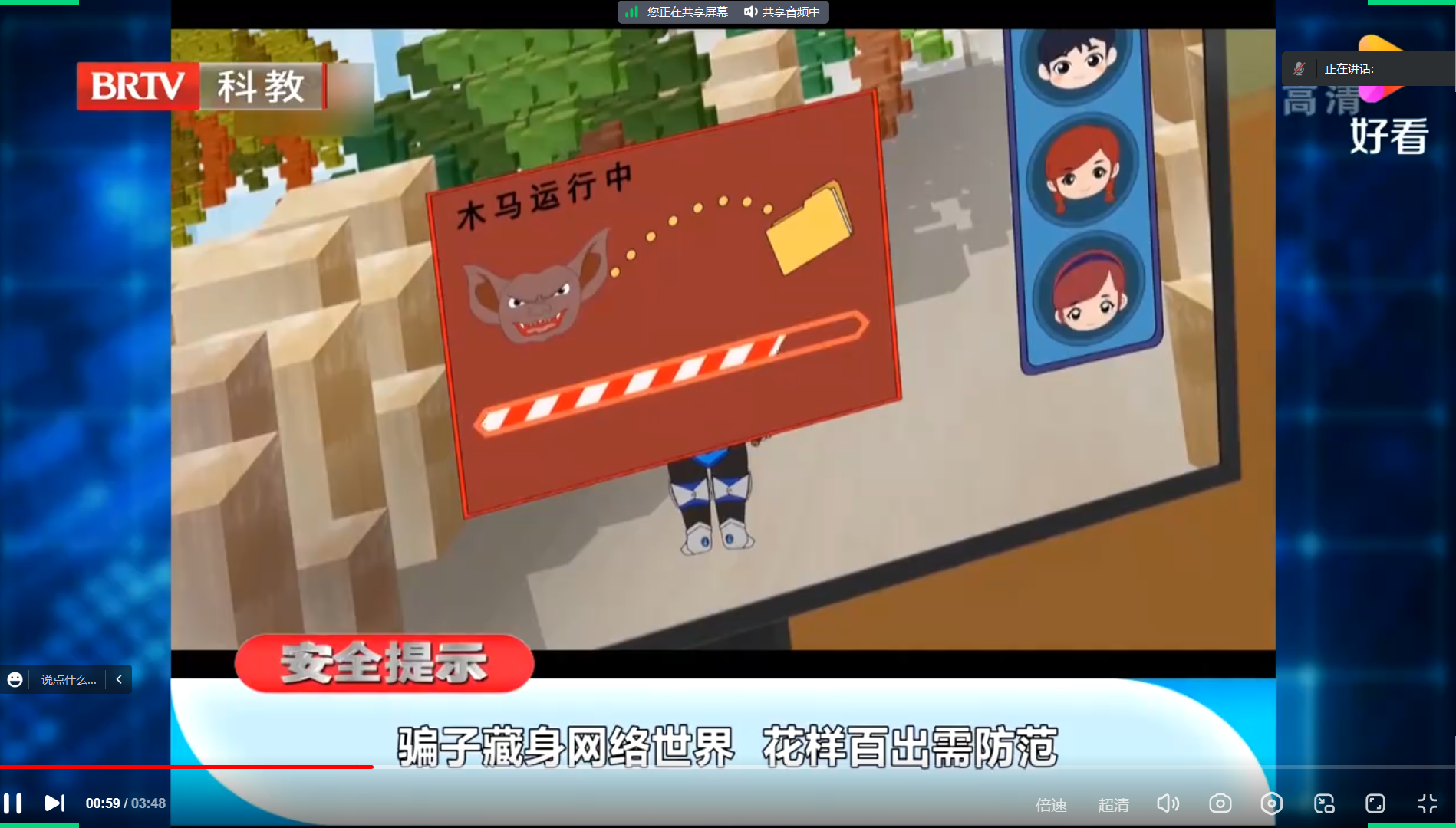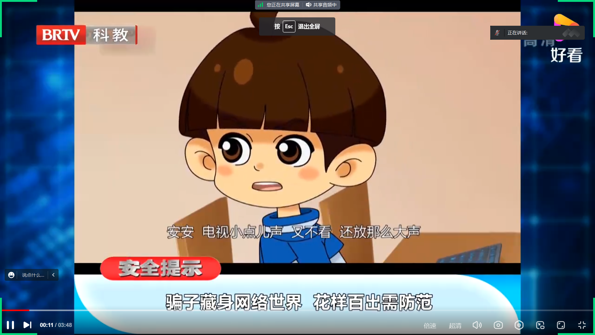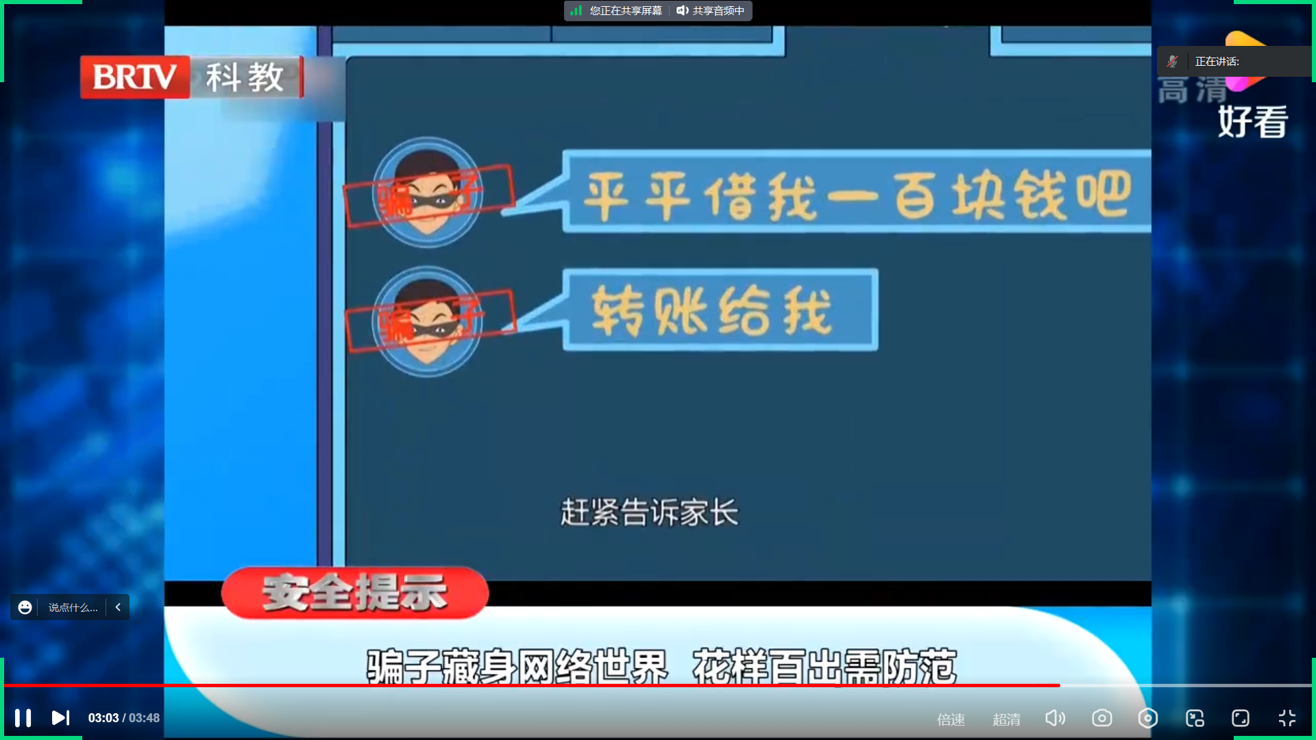 会议中,团支书共享屏幕和同学们一起观看防诈骗宣传视频。在一共观看了3个视频后,团支书讲解如何防诈骗的具体做法。通过PPT的形式向同学们展示该内容。