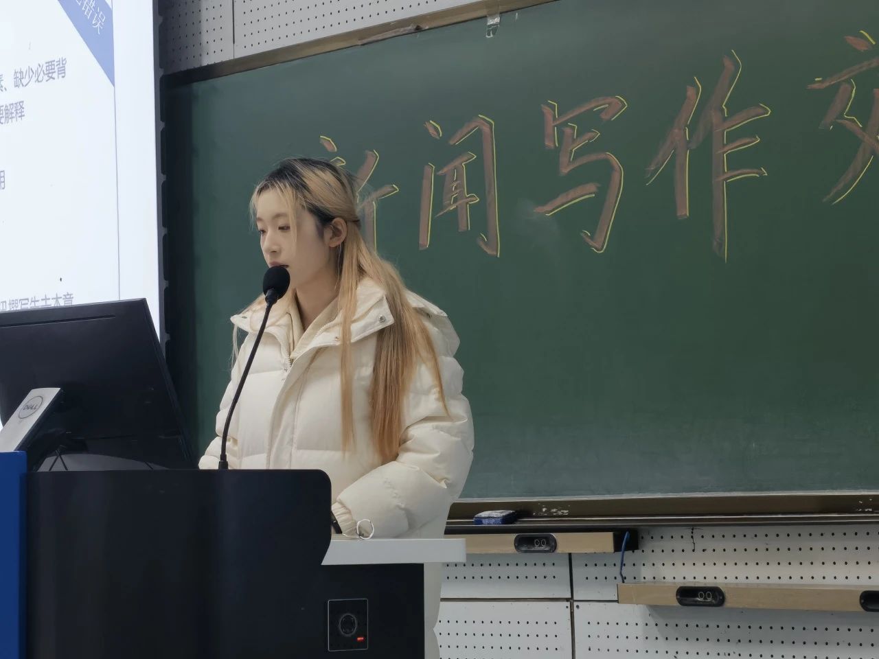 刘晨欣同学简要介绍了新闻体裁和格式规范,并主要介绍了通讯的定义、特点、分类和结构,其中在结构方面强调了标题、主题和结尾等的相关写作要求。刘晨欣同学还举例讲述了关于素材准备、出席活动、注意事项、常见错误等的细节。