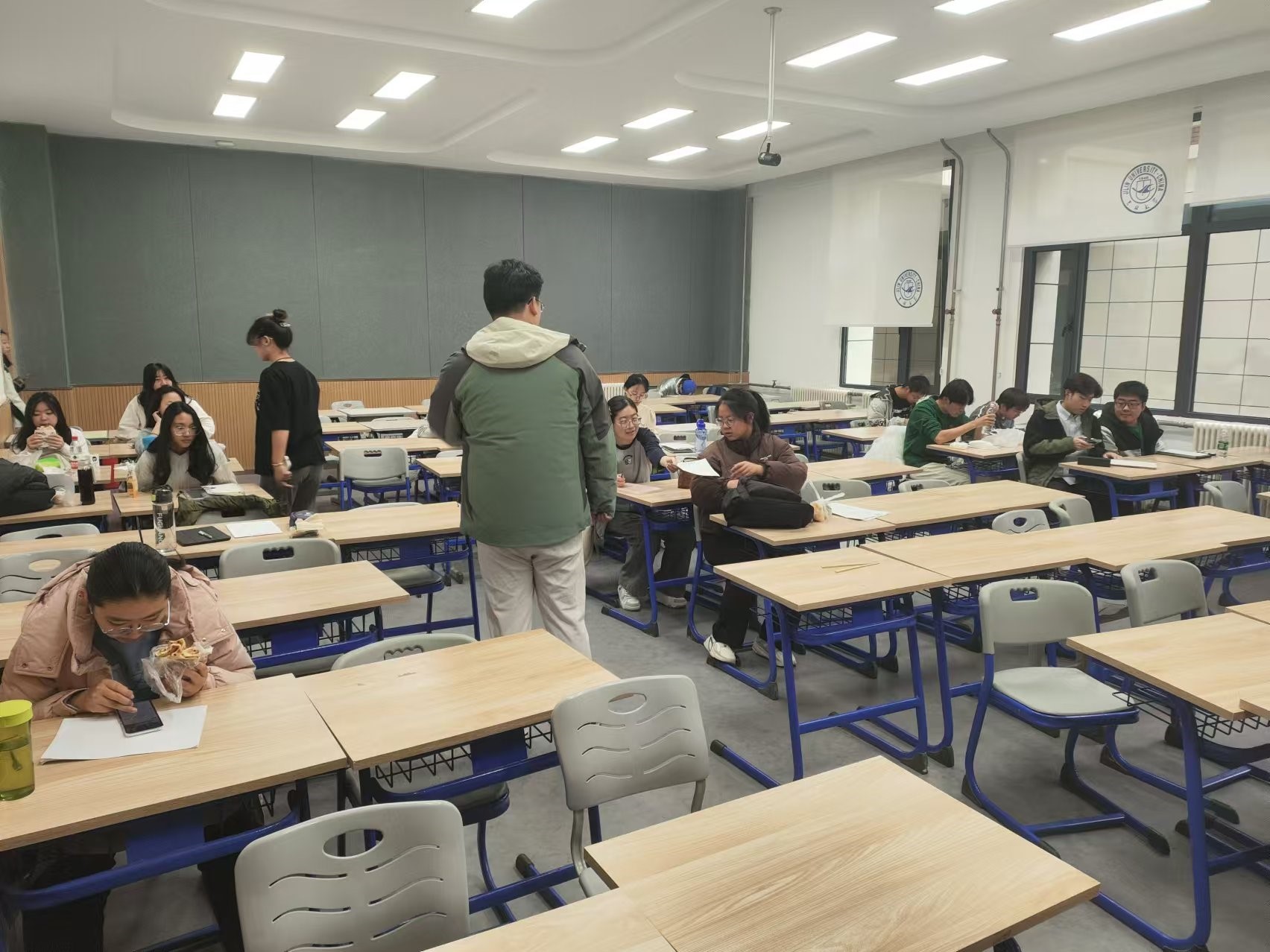 11月4日,2023级辅导员姜岳彤老师进入《地球科学概论》课堂,同任课教师沟通教学进度及考试安排,提醒同学们前排就坐。本科课程共2人迟到。同日,姜老师进入南苑二公寓学生寝室,检查违章电器及充电器使用后是否收起,同时到爱心寝室看望骨折学生情况,提醒其在线上认真完成课程。