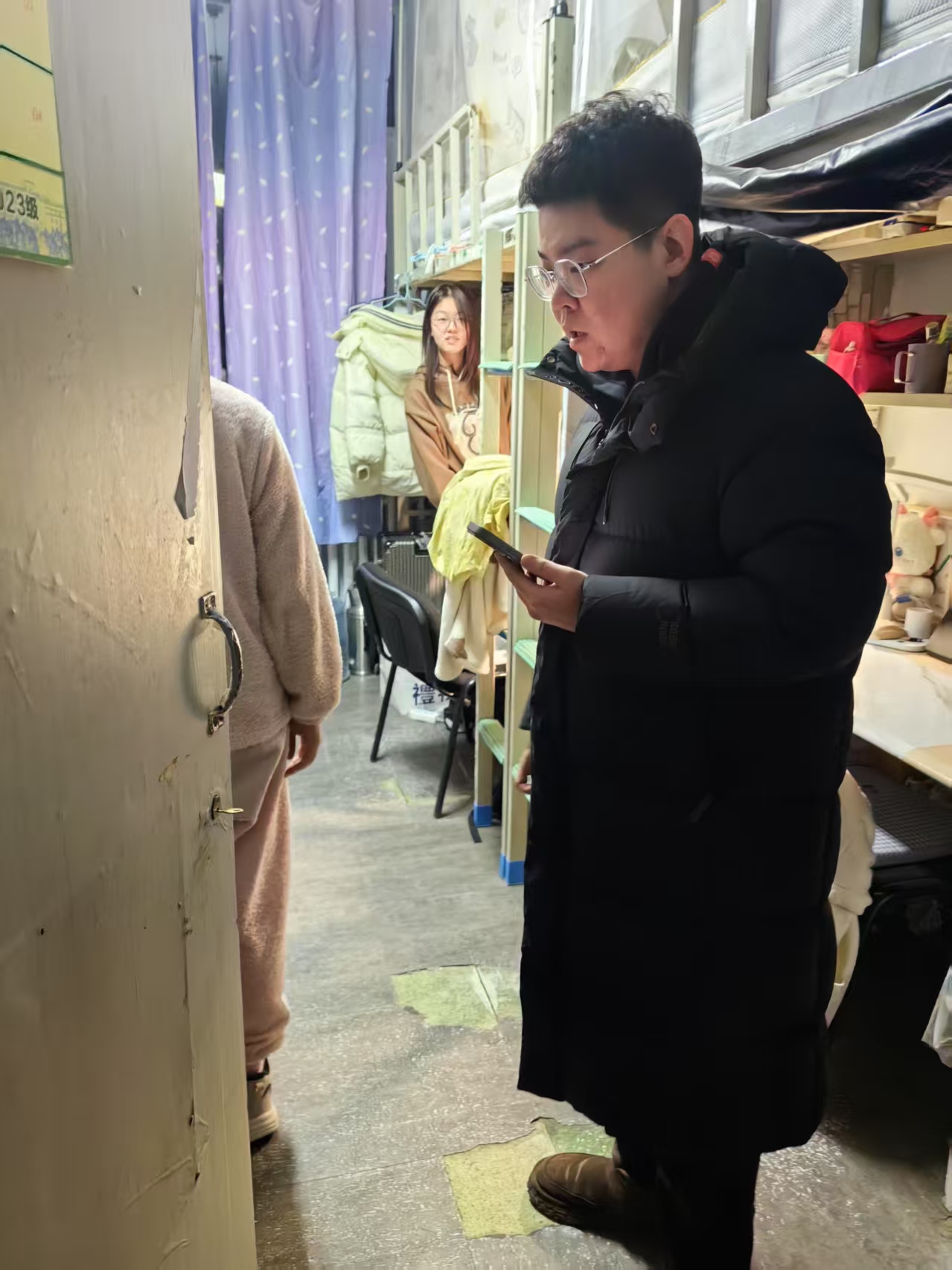 辅导员老师们分别进入南苑一公寓、南苑二公寓、南苑三公寓、朝阳五公寓、朝阳七公寓五所公寓,通过晚点名的方式准确掌握学生返校动态,提醒同学们保持寝室卫生,养成良好的生活习惯,以全新的面貌迎接新学期。走寝过程中,学院党委副书记、2024级辅导员吴哲老师询问了同学们返校是否习惯,叮嘱大家新学期按时上课认真听讲;2023级辅导员姜岳彤老师叮嘱同学们认真面对新学期的学习任务,实现更大的自我提升;2022级辅导员母茂松老师提醒同学们大学进入毕业选择的重要关口,欢迎同学们随时来聊聊制定专属成长方案;2021级辅导员李薇老师为即将查分的考研学生送上祝福,为正在备战公务员考试、找工作的同学打气加油。