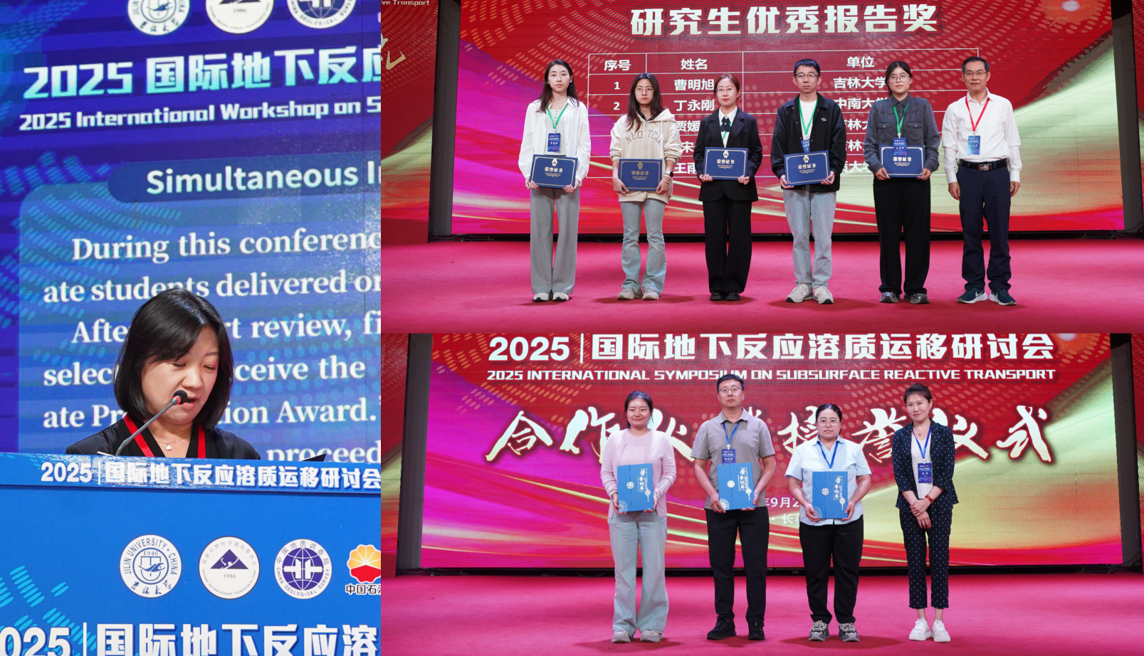 2025国际地下反应溶质运移研讨会设置9个分会场,涉及地下水质的形成及供水安全、土壤及地下水污染形成与修复、二氧化碳及废弃物地质封存、地热及地下能源资源开发等主题。分会场共有122个口头报告,24个研究生论坛报告。参会学生和在职人员参会比例相近,体现出年轻化的学术氛围。大会评选了研究生优秀报告奖5名,在大会闭幕式举行了颁奖典礼。同时,举行了合作伙伴授誉仪式,为大会的赞助单位颁发证书。闭幕式由自拍视频