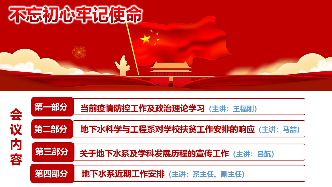 会议包括四方面内容:分别是当前疫情防控工作及政治理论学习、全系教师响应学校扶贫工作安排、地下水科学与工程系及学科发展历程的宣传工作、以及近期系里的教学等相关工作安排。