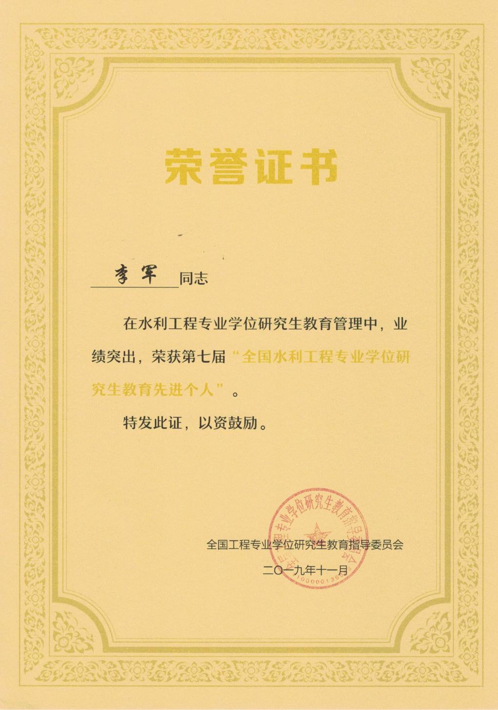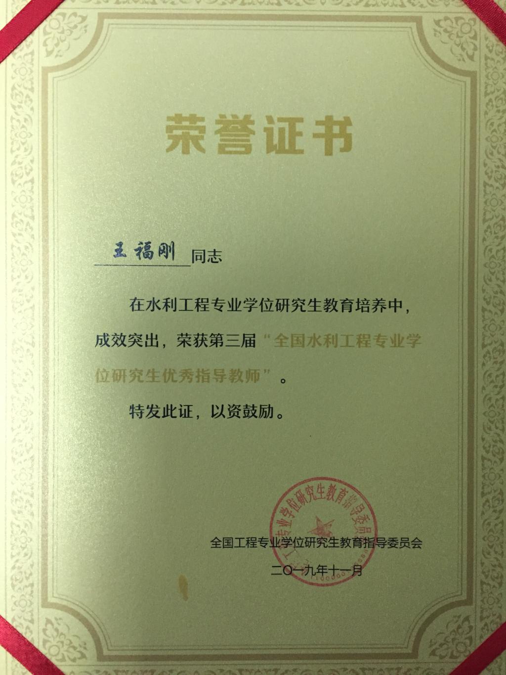 为更好地总结、交流水利工程专业学位研究生教育培养的工作和指导经验,促进水利工程专业学位研究生教育发展,提高导师指导能力,不断提高培养质量,经个人申请、单位推荐、水利工程领域核心组成员和专家投票、教指委审定,2019年共有18名指导教师被评为全国水利工程专业学位研究生优秀指导教师,14 名教工被评为全国水利工程专业学位研究生教育工作先进个人,其中自拍视频 王福刚教授