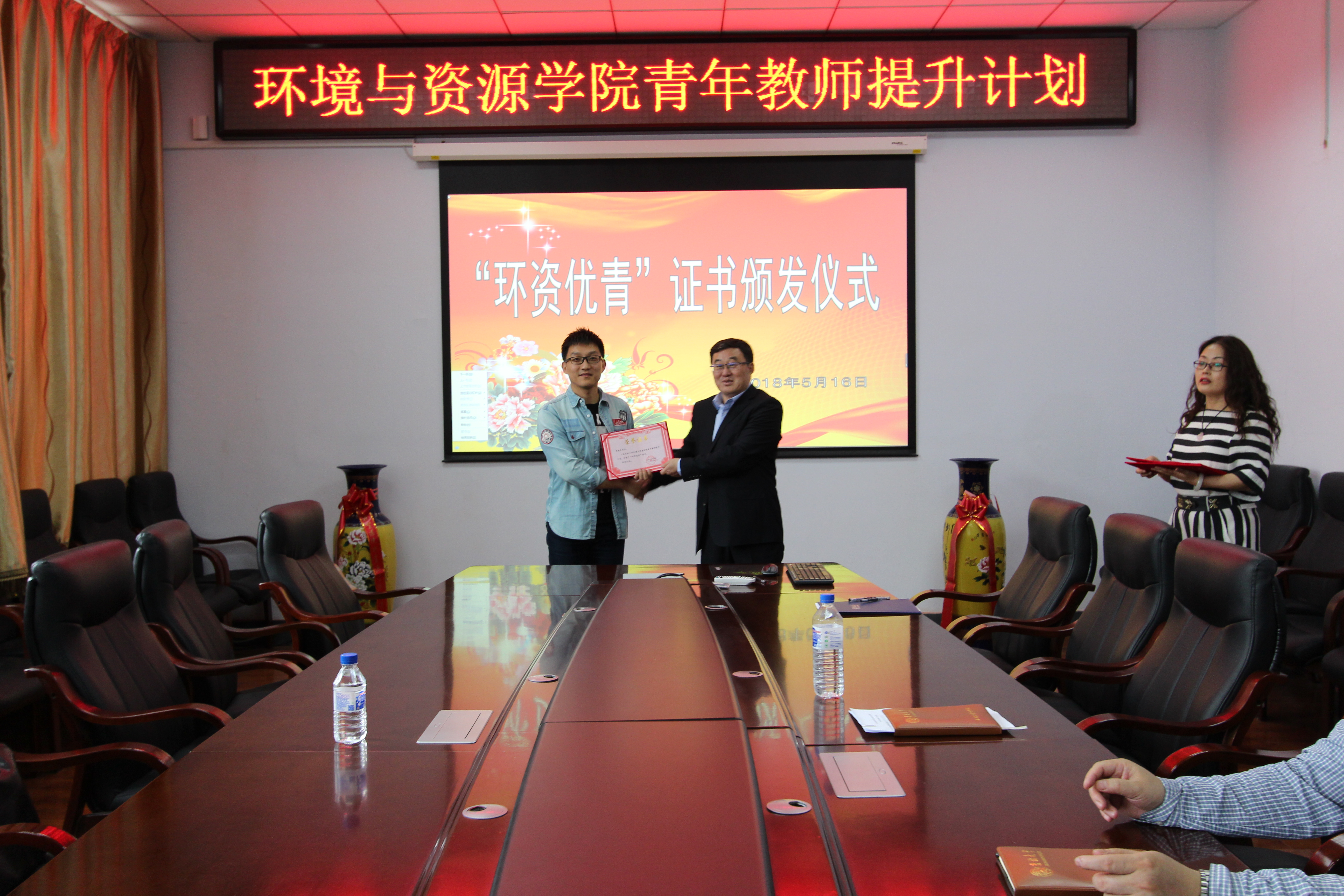 环境与资源学院青年教师提升(简称“环资优青”)计划》的工作安排5月16日下午,环境与资源学院在北区理化楼260会议室,举行了2018年度“环资优青”证书颁发仪式。学院班子和学院2018年度“环资优青”获得者参加了证书颁发仪式。仪式由分管科研的花修艺副院长主持。