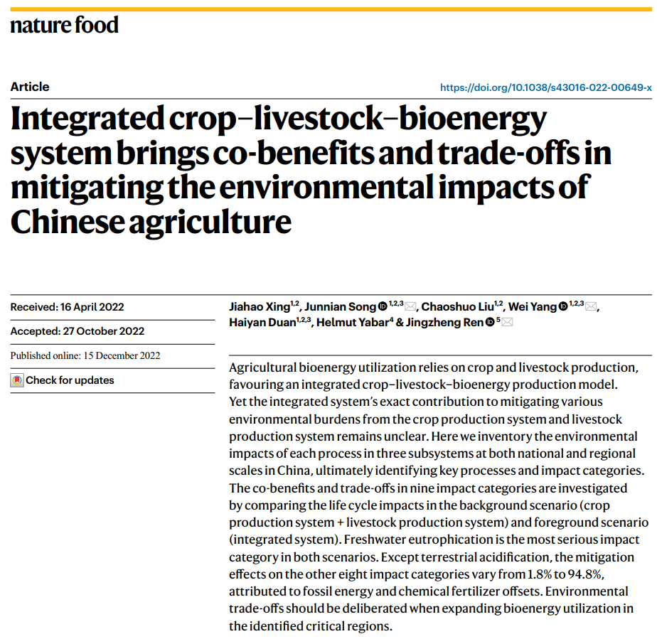 宋俊年教授研究团队领衔,与日本筑波大学、香港理工大学研究团队合作,在生物质能利用与农业环境影响研究领域取得重要进展,研究成果以“Integrated crop-livestock-bioenergy system brings co-benefits and trade-offs in mitigating the environmental impacts of Chinese agriculture”为题发表在农业与食物领域顶级期刊《Nature Food》。自拍视频