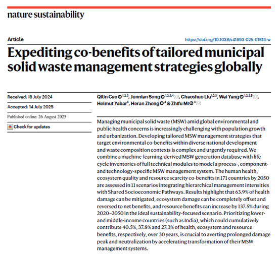 宋俊年教授、杨巍副教授领衔的“食物农业生物质(FAB)”研究团队在城市固废可持续管理领域取得突破性成果,以“Expediting co-benefits of tailored municipal solid waste management strategies globally”为题在《Nature Sustainability》发表研究长文。博士生曹琪林为论文唯一第一作者,宋俊年教授、杨巍副教授、伦敦大学学院米志付教授为共同通讯作者,自拍视频