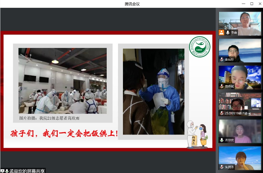 活动伊始,党支部组织委员兼宣传委员牛梦圆同学带领大家一起学习了《致全省各级党组织和广大共产党员的一封信》以及《致全校各级党组织和广大党员的倡议书》。随后,四位党员志愿者代表分别分享了自己的战疫故事。孟益坎同学向大家展示了几组图片,讲述了自己从看到老师同学们积极参与疫情防控到自己和室友们一起参与防控的故事,分享了自己在清晨为大家发放完早餐后获得的自豪和光荣。她用“聚是一团火,散是满天星”形容一直奋战在校园疫情防控第一线的志愿者。一直驻校工作的钟宇博老师也分享了他这段时间的工作感受,他最后说“我们终会在春暖花开的校园里,迎接自拍视频